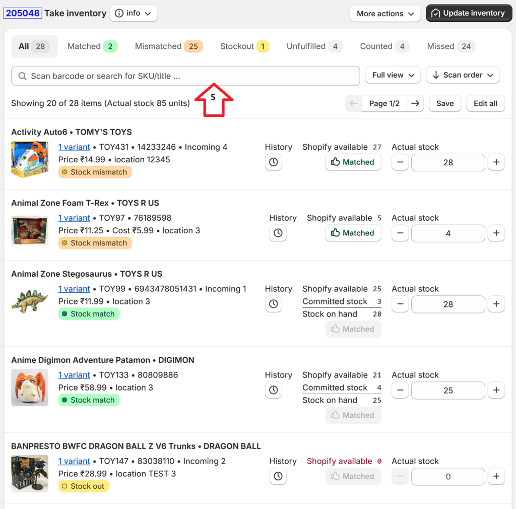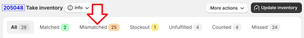 5. The app will modify your product counts in Shopify only if you click “Update inventory” after you finish counting stock. To ensure you are completely aware of all changes that the app is going to make, you are advised to click the “Mismatched” tab before you do an inventory update. This tab will list all the products that are going to be adjusted because your counted stock (Actual stock) is different from Shopify’s available stock. Click the “Missed” tab to see all products you have not scanned/counted.